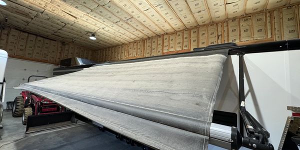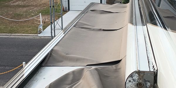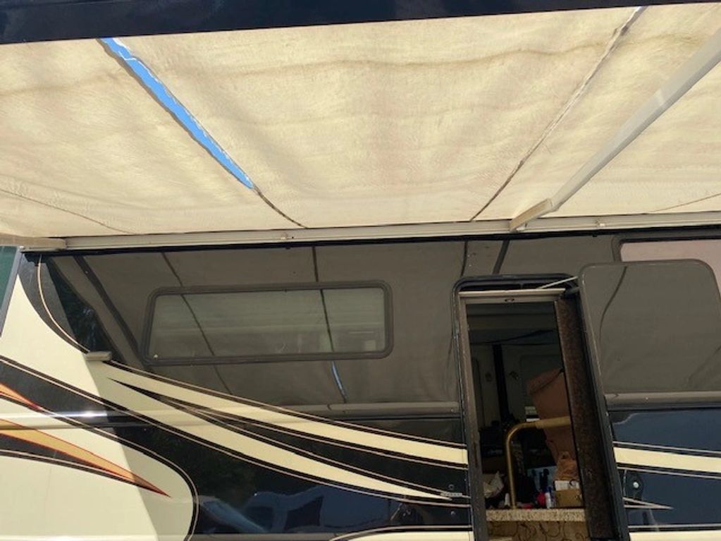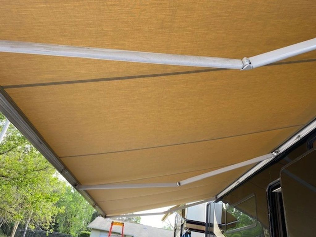 Our customer had sagging and drooping Carefree of Colorado "Paramount" awnings on his 2018 Tiffin Allegro Bus. The side seams had stretched and warped due to weathering and polyester cotton stitching rotted and missing. These Carefree of Colorado awning were made with horizontal seams running left to right along the awning, which while they work, are not as strong as vertical seams.