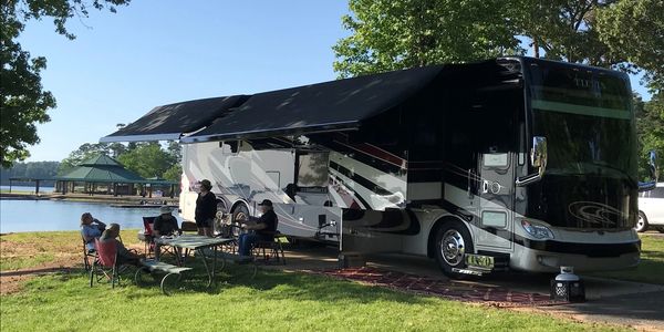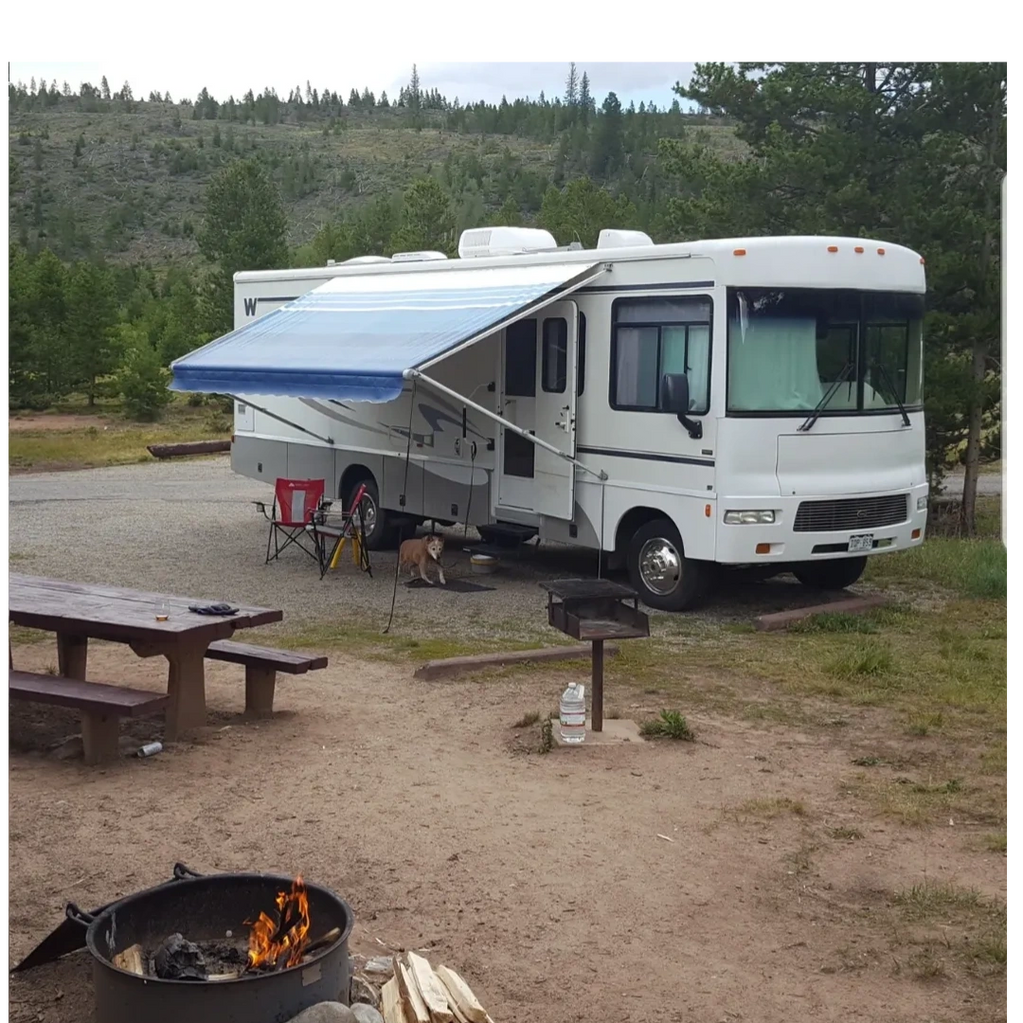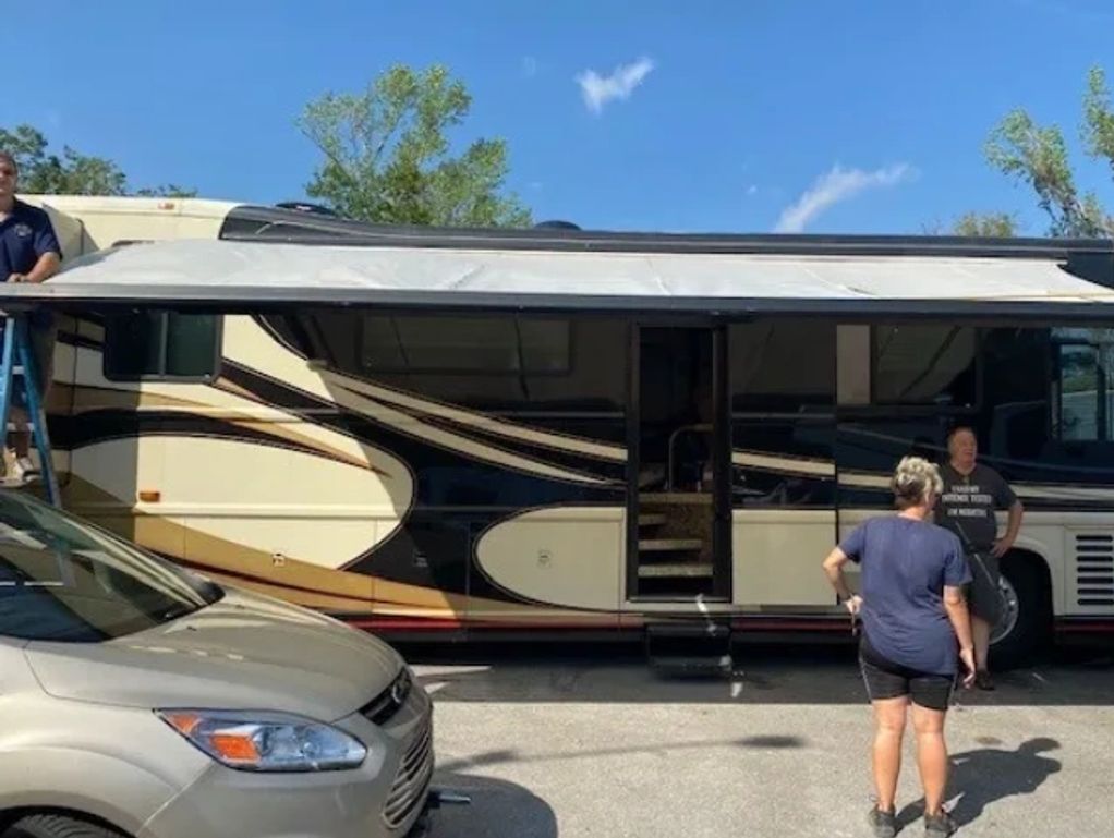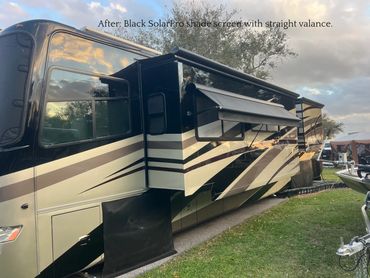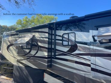 Before and after from OEM Dometic Weatherpro scalloped replacement patio awning to Stone Vos "CoachGuard" acrylic in Linen Beige Tweed CG-407/52 with scalloped binding in Black. Stitched with Clear Solarfix thread. 10 year warranty.